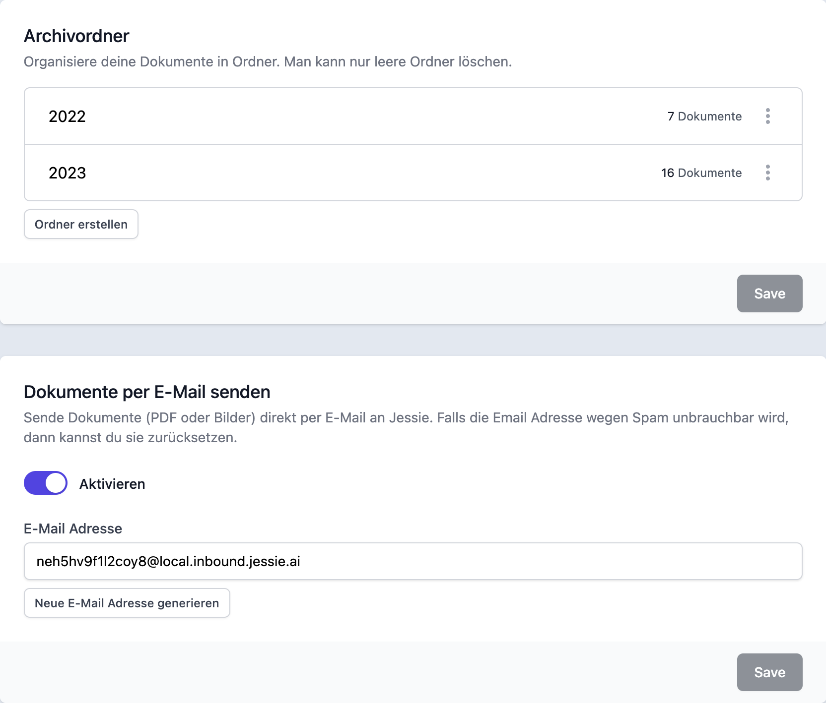 Entdecke die bequeme Art und Weise, wie du Dokumente mit Jessie verwalten kannst. Ziehe deine Dateien einfach per Drag & Drop direkt in unser System und lade sie mühelos hoch. Alternativ kannst du sie auch ganz einfach per E-Mail an Jessie senden. Jessie ermöglicht es dir zudem, deine Dokumente und Dateien in übersichtlichen Ordnern zu organisieren. Benenne Ordner um, ändere die Reihenfolge der Dateien und behalte stets die volle Kontrolle über deine Informationen. Unsere benutzerfreundliche Oberfläche macht das Organisieren zu einem intuitiven und effizienten Prozess.