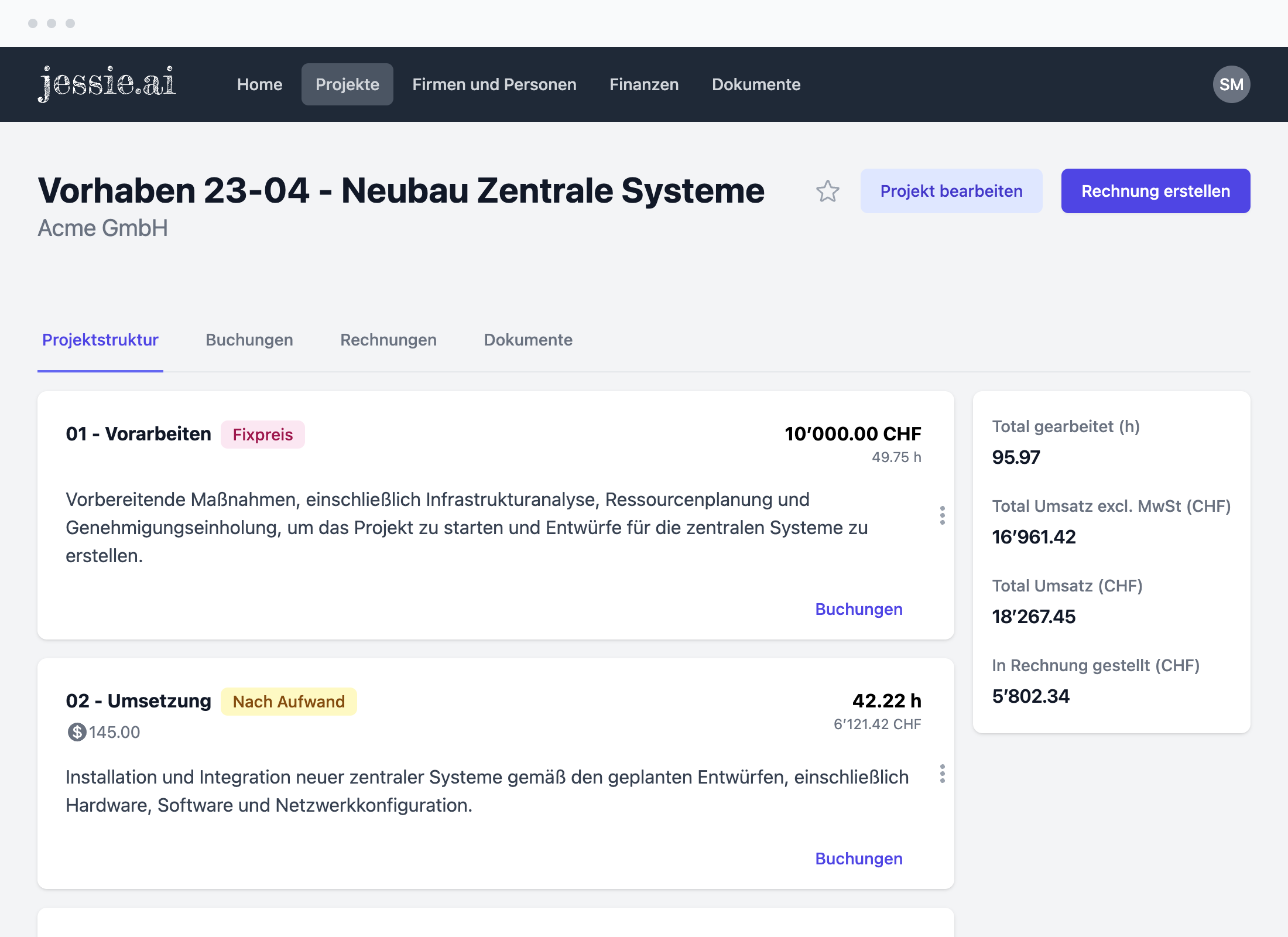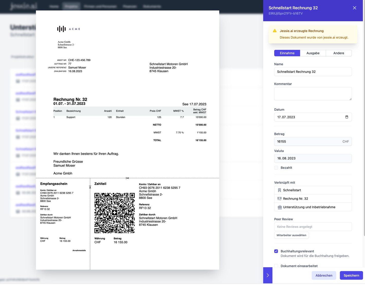 Erlebe die bequeme und effiziente Art der Rechnungserstellung und -verwaltung in Jessie. Du kannst direkt in deinen Projekten Rechnungen erstellen und verwalten. Verabschiede dich von umständlichen externen Tools oder Systemen und halte deine Finanzen übersichtlich an einem Ort. Behalte den Überblick über deine Rechnungen und optimiere deinen Abrechnungsprozess mit Jessie. Nutze unsere benutzerfreundliche Plattform, um professionelle Rechnungen zu erstellen und deine Projektabrechnungen nahtlos zu verwalten. Darüber hinaus erstellt Jessie direkt auch QR-Code-Rechnungen und vereinfacht so die Zahlungsabwicklung für deine Kunden.